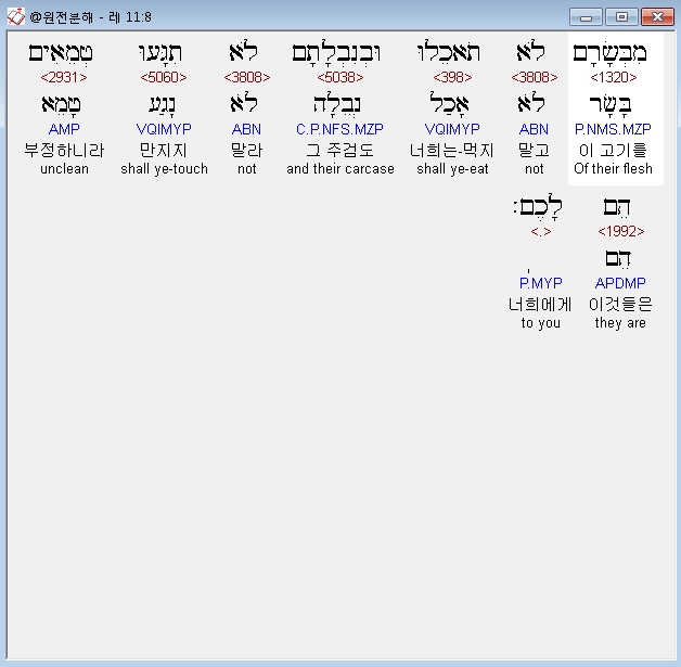 부정하고 - 이말의 기본 동사 '타메'(*)는 특히 신성하고 거룩한 것을 '더럽히다', '모독하다'는 뜻으로 단순히 깨끗치 않다는 수동적 의미보다는, 그로 인해 깨끗한 율법 관계가 더럽혀 진다는 능동적 의미가 강한 말이다. 한편 당시의 정결법상 부정하다고 식용이 금지된 짐승은 실제로 건강상, 위생상으로도 별로 좋지 않다는 것이 오늘날의 학계의 일반적인 견해이다.