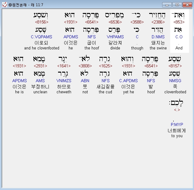 히브리어구약BHS,7 וְאֶת־הַחֲזִיר כִּי־מַפְרִיס פַּרְסָה הוּא וְשֹׁסַע שֶׁסַע פַּרְסָה וְהוּא גֵּרָה לֹא־יִגָּר טָמֵא הוּא לָכֶם׃