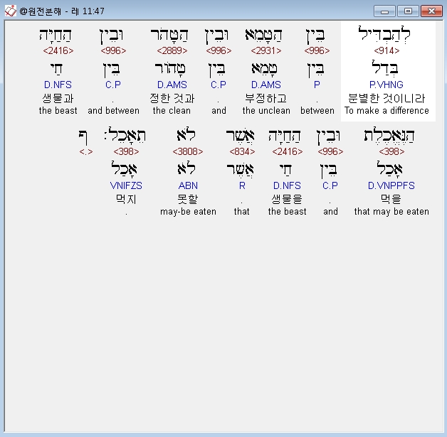 우리말성경,47 부정한 것과 정결한 것, 먹을 수 있는 생물과 먹을 수 없는 생물 사이를 구분하기 위함이다."