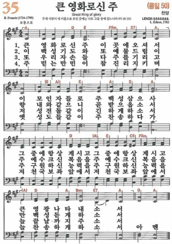새찬송가 35장 큰 영화로신 주-악보 PPT(배경X) 35 큰 영화로신 주 찬양 A 4/4 35장 | 큰 영화로신 주 | 찬양 1. 큰 영화로신 주 이 곳에 오셔서 이 모인 자들로 주 백성 삼으사 그 중에 항상 계시고 그