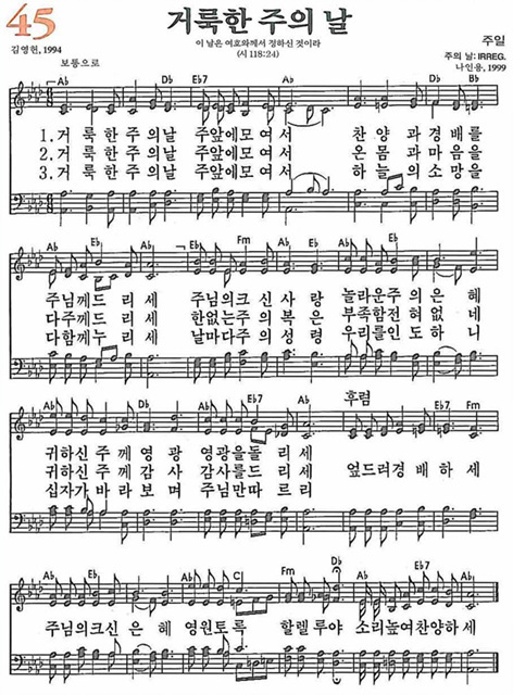 새찬송가 45장 거룩한 주의 날-악보 PPT(배경X) 45 거룩한 주의 날 주일 Ab 6/8 45장 | 거룩한 주의 날 | 주일 1. 거룩한 주의 날 주 앞에 모여서 찬양과 경배를 주님께 드리세 주님의 크신 사랑 놀라운