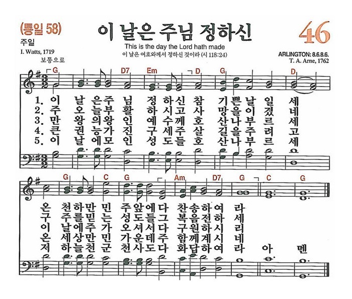 새찬송가 46장 이 날은 주님 정하신-악보 PPT(배경X) 46 이 날은 주님 정하신 주일 G 3/2 46장 | 이 날은 주님 정하신 | 주일 1. 이 날 은 주님 정하신 참 기쁜 날일세 온 천하 만민 주 앞에 다 찬송 하여