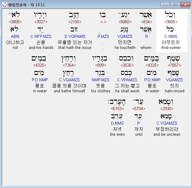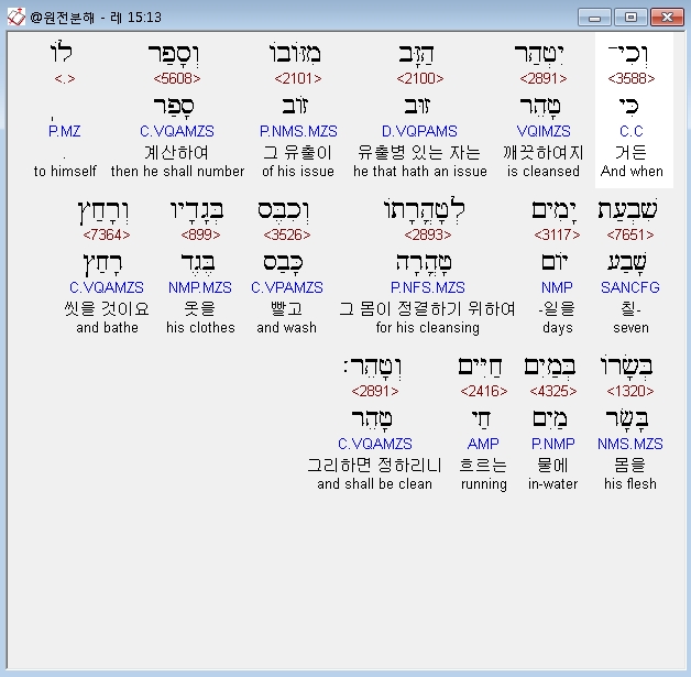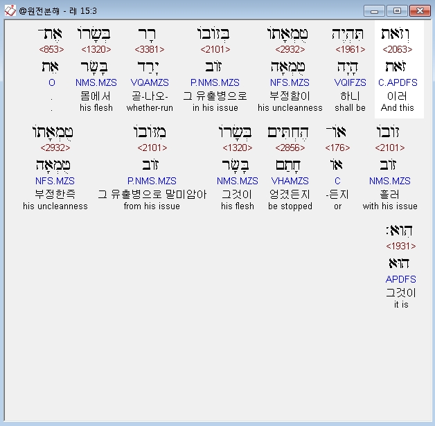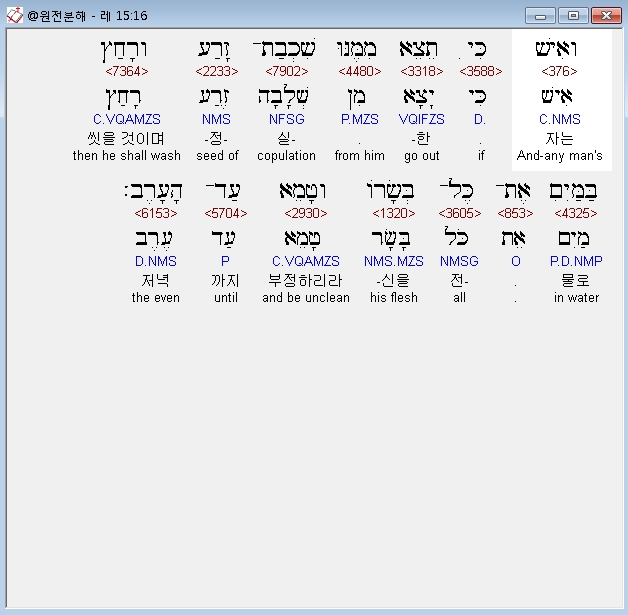 헬라어구약Septuagint,3 και ουτος ο νομος της ακαθαρσιας αυτου ρεων γονον εκ σωματος αυτου εκ της ρυσεως ης συνεστηκεν το σωμα αυτου δια της ρυσεως αυτη η ακαθαρσια αυτου εν αυτω πασαι αι ημεραι ρυσεως σωματος αυτου η συνεστηκεν το σωμα αυτου δια της ρυσεως ακαθαρσια αυτου εστιν
