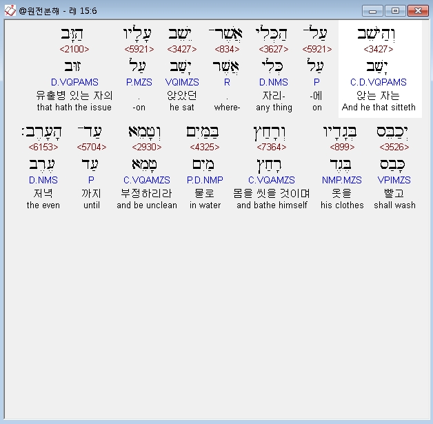 히브리어구약BHS,6 וְהַיֹּשֵׁב עַל־הַכְּלִי אֲשֶׁר־יֵשֵׁב עָלָיו הַזָּב יְכַבֵּס בְּגָדָיו וְרָחַץ בַּמַּיִם וְטָמֵא עַד־הָעָרֶב׃