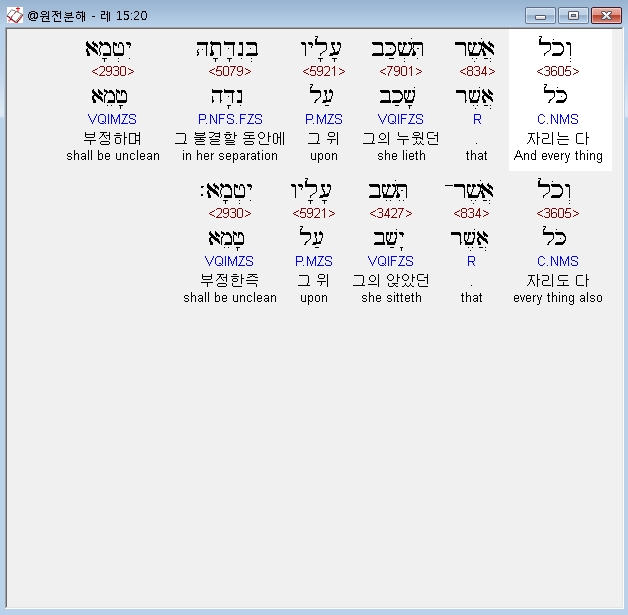 히브리어구약BHS,4 כָּל־הַמִּשְׁכָּב אֲשֶׁר יִשְׁכַּב עָלָיו הַזָּב יִטְמָא וְכָל־הַכְּלִי אֲשֶׁר־יֵשֵׁב עָלָיו יִטְמָא׃