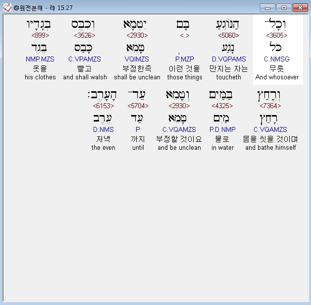 히브리어구약BHS,27 וְכָל־הַנֹּוגֵעַ בָּם יִטְמָא וְכִבֶּס בְּגָדָיו וְרָחַץ בַּמַּיִם וְטָמֵא עַד־הָעָרֶב׃