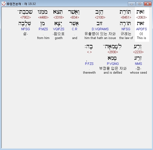 히브리어구약BHS,32 זֹאת תֹּורַת* הַזָּב וַאֲשֶׁר תֵּצֵא מִמֶּנּוּ שִׁכְבַת־זֶרַע לְטָמְאָה־בָהּ׃