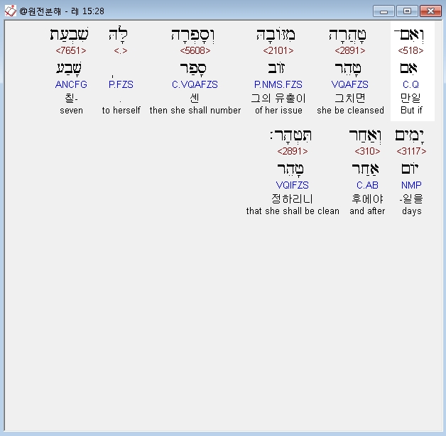히브리어구약BHS,28 וְאִם־טָהֲרָה מִזֹּובָהּ וְסָפְרָה לָּהּ שִׁבְעַת יָמִים וְאַחַר תִּטְהָר׃