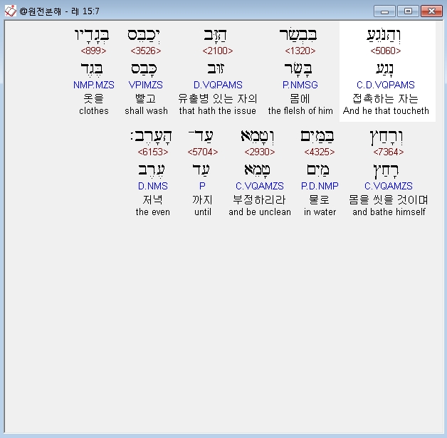 히브리어구약BHS,7 וְהַנֹּגֵעַ בִּבְשַׂר הַזָּב יְכַבֵּס בְּגָדָיו וְרָחַץ בַּמַּיִם וְטָמֵא עַד־הָעָרֶב׃