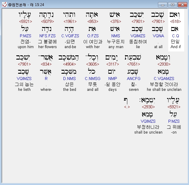 헬라어구약Septuagint,4 πασα κοιτη εφ' η εαν κοιμηθη επ' αυτης ο γονορρυης ακαθαρτος εστιν και παν σκευος εφ' ο εαν καθιση επ' αυτο ο γονορρυης ακαθαρτον εσται