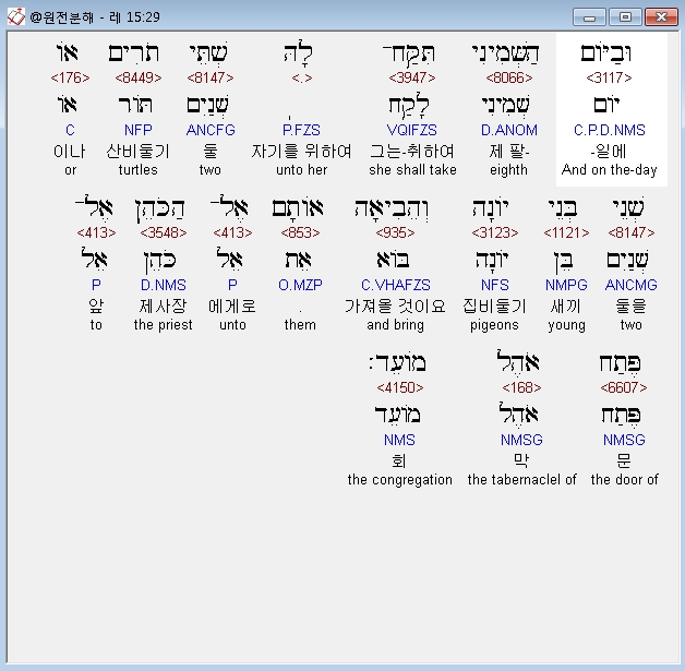 영어NASB,29 'Then on the eighth day she shall take for herself two turtledoves or two young pigeons, and bring them in to the priest, to the doorway of the tent of meeting.