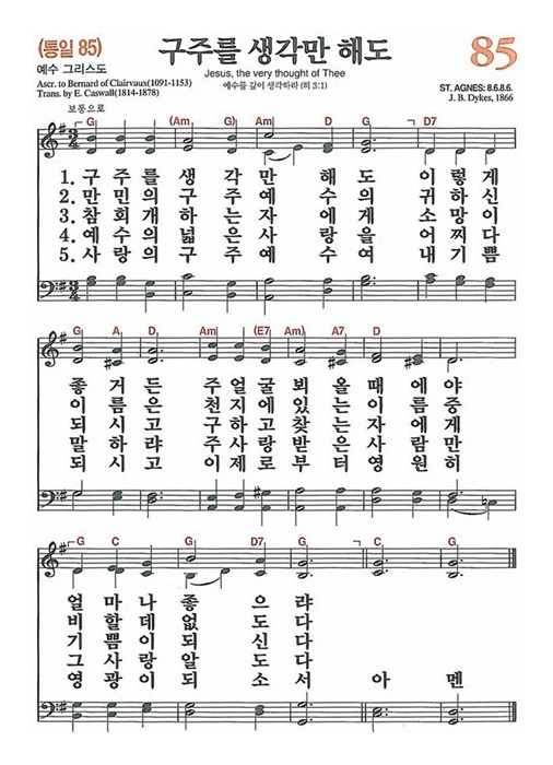 중세의 수도사 베르나르(Bernard of Clairvaux, 1091~1153)가 라틴어로 쓴 "Jesu, dulcis memoria"라는 예수의 이름에 대한 즐거운 시(Jubilus rhythmicus de nomine Jesu) 192행의 긴 시에서, 영국의 캐스월(Edward Caswall)이 영역하여 그의 가톨릭 노래집(Lyra Catholica, 1849년)에 처음 수록한 찬송이다.
