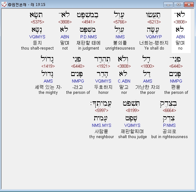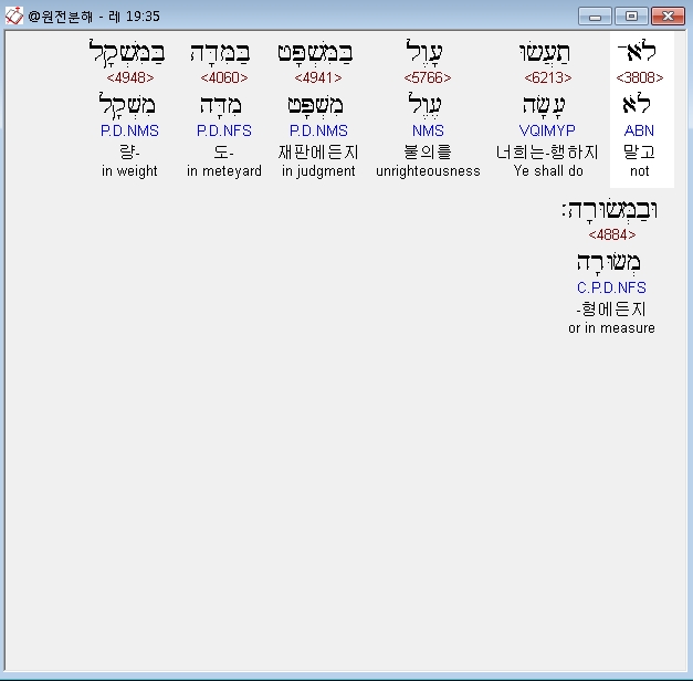 히브리어구약BHS,35 לֹא־תַעֲשׂוּ עָוֶל בַּמִּשְׁפָּט בַּמִּדָּה בַּמִּשְׁקָל וּבַמְּשׂוּרָה׃
