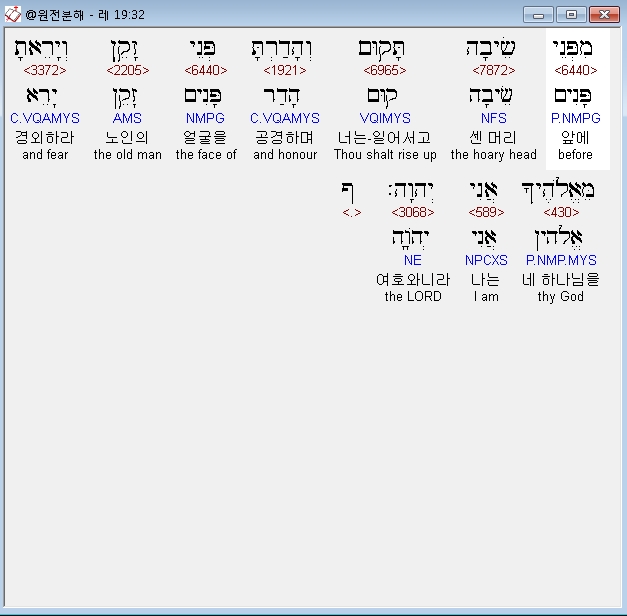 히브리어구약BHS,32 מִפְּנֵי שֵׂיבָה תָּקוּם וְהָדַרְתָּ פְּנֵי זָקֵן וְיָרֵאתָ מֵּאֱלֹהֶיךָ אֲנִי יְהוָה׃ ף