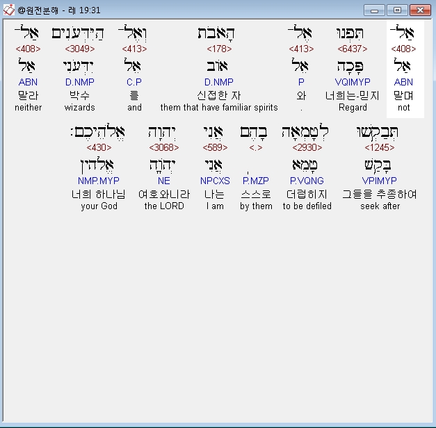 히브리어구약BHS,31 אַל־תִּפְנוּ אֶל־הָאֹבֹת וְאֶל־הַיִּדְּעֹנִים אַל־תְּבַקְשׁוּ לְטָמְאָה בָהֶם אֲנִי יְהוָה אֱלֹהֵיכֶם׃