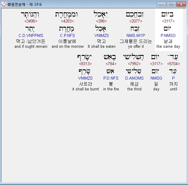 히브리어구약BHS,6 בְּיֹום זִבְחֲכֶם יֵאָכֵל וּמִמָּחֳרָת וְהַנֹּותָר עַד־יֹום הַשְּׁלִישִׁי בָּאֵשׁ יִשָּׂרֵף׃