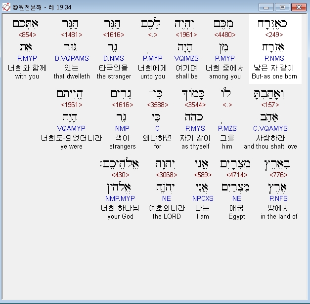 히브리어구약BHS,34 כְּאֶזְרָח םִכֶּם יִהְיֶה לָכֶם הַגֵּר הַגָּר אִתְּכֶם וְאָהַבְתָּ לֹו כָּמֹוךָ כִּי־גֵרִים הֱיִיתֶם בְּאֶרֶץ מִצְרָיִם אֲנִי יְהוָה אֱלֹהֵיכֶם׃