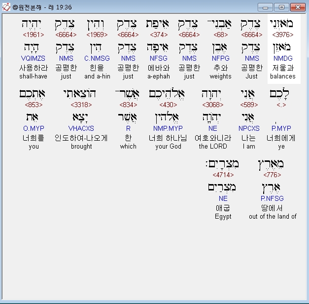 히브리어구약BHS,36 מֹאזְנֵי צֶדֶק אַבְנֵי־צֶדֶק אֵיפַת צֶדֶק וְהִין צֶדֶק יִהְיֶה לָכֶם אֲנִי יְהוָה אֱלֹהֵיכֶם אֲשֶׁר־הֹוצֵאתִי אֶתְכֶם מֵאֶרֶץ מִצְרָיִם׃