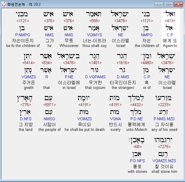 히브리어구약BHS,2 וְאֶל־בְּנֵי יִשְׂרָאֵל תֹּאמַר אִישׁ אִישׁ מִבְּנֵי יִשְׂרָאֵל וּמִן־הַגֵּר הַגָּר בְּיִשְׂרָאֵל אֲשֶׁר יִתֵּן מִזַּרְעֹו לַמֹּלֶךְ מֹות יוּמָת עַם הָאָרֶץ יִרְגְּמֻהוּ בָאָבֶן׃