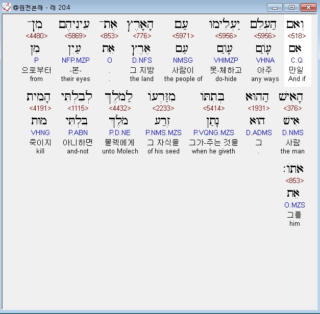 히브리어구약BHS,4 וְאִם הַעְלֵם יַעְלִימוּ* עַם הָאָרֶץ אֶת־עֵינֵיהֶם מִן־הָאִישׁ הַהוּא בְּתִתֹּו מִזַּרְעֹו לַמֹּלֶךְ לְבִלְתִּי הָמִית אֹתֹו׃