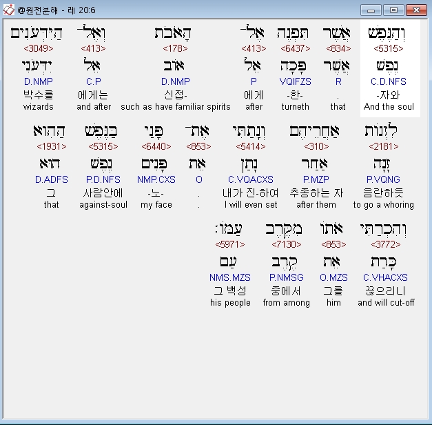 히브리어구약BHS,6 וְהַנֶּפֶשׁ אֲשֶׁר תִּפְנֶה אֶל־הָאֹבֹת וְאֶל־הַיִּדְּעֹנִים לִזְנֹות אַחֲרֵיהֶם וְנָתַתִּי אֶת־פָּנַי בַּנֶּפֶשׁ הַהִוא וְהִכְרַתִּי אֹתֹו מִקֶּרֶב עַמֹּו׃