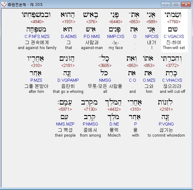 히브리어구약BHS,5 וְשַׂמְתִּי אֲנִי אֶת־פָּנַי בָּאִישׁ הַהוּא וּבְמִשְׁפַּחְתֹּו וְהִכְרַתִּי אֹתֹו וְאֵת כָּל־הַזֹּנִים אַחֲרָיו לִזְנֹות אַחֲרֵי הַמֹּלֶךְ מִקֶּרֶב עַםָּם׃
