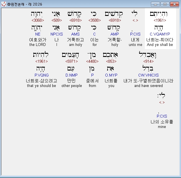 히브리어구약BHS,26 וִהְיִיתֶם לִי קְדֹשִׁים כִּי קָדֹושׁ אֲנִי יְהוָה וָאַבְדִּל אֶתְכֶם מִן־הָעַמִּים לִהְיֹות לִי׃