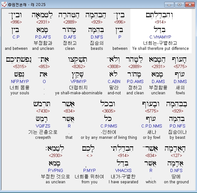 히브리어구약BHS,25 וְהִבְדַּלְתֶּם בֵּין־הַבְּהֵמָה הַטְּהֹרָה לַטְּמֵאָה וּבֵין־הָעֹוף הַטָּמֵא לַטָּהֹר וְלֹא־תְשַׁקְּצוּ אֶת־נַפְשֹׁתֵיכֶם בַּבְּהֵמָה וּבָעֹוף וּבְכֹל אֲשֶׁר תִּרְמֹשׂ הָאֲדָמָה אֲשֶׁר־הִבְדַּלְתִּי לָכֶם לְטַמֵּא׃
