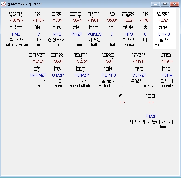히브리어구약BHS,27 וְאִישׁ אֹו־אִשָּׁה כִּי־יִהְיֶה* בָהֶם אֹוב אֹו יִדְּעֹנִי מֹות יוּמָתוּ בָּאֶבֶן יִרְגְּמוּ אֹתָם דְּמֵיהֶם בָּם׃ ף
