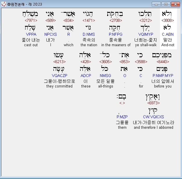 히브리어구약BHS,23 וְלֹא תֵלְכוּ בְּחֻקֹּת הַגֹּוי אֲשֶׁר־אֲנִי מְשַׁלֵּחַ מִפְּנֵיכֶם כִּי אֶת־כָּל־אֵלֶּה עָשׂוּ וָאָקֻץ בָּם׃