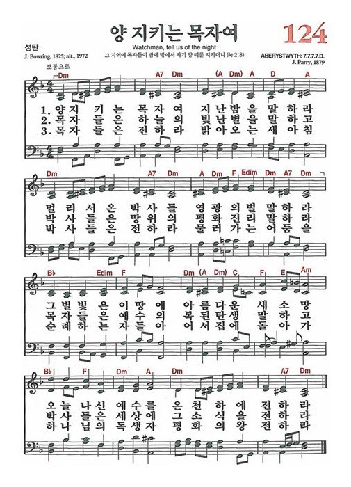 이 찬송의 영어 원 가사는 'Watchman, tell us of the night'「우리 구주 나신 날」이다. 그런데 한국 최초의 장・감 합동 찬송가인《찬숑가, 1908》편집 때, 누군가가 완전히 우리말로 개작을 했기 때문에, 원작을 되살리게 된 것이다. 이 찬송의 주요 명제는「예수 나심을 가서 전하라」는 천사의 명령이다.