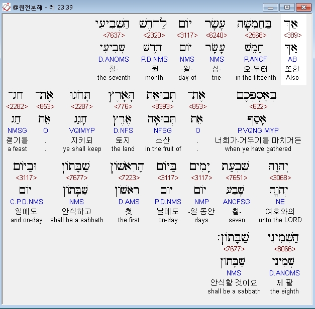 히브리어구약BHS,39 אַךְ בַּחֲמִשָּׁה עָשָׂר יֹום לַחֹדֶשׁ הַשְּׁבִיעִי בְּאָסְפְּכֶם אֶת־תְּבוּאַת הָאָרֶץ תָּחֹגּוּ אֶת־חַג־יְהוָה שִׁבְעַת יָמִים בַּיֹּום הָרִאשֹׁון שַׁבָּתֹון וּבַיֹּום הַשְּׁמִינִי שַׁבָּתֹון׃