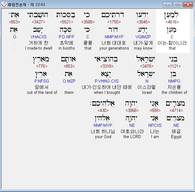 히브리어구약BHS,43 לְמַעַן יֵדְעוּ דֹרֹתֵיכֶם כִּי בַסֻּכֹּות הֹושַׁבְתִּי אֶת־בְּנֵי יִשְׂרָאֵל בְּהֹוצִיאִי אֹותָם מֵאֶרֶץ מִצְרָיִם אֲנִי יְהוָה אֱלֹהֵיכֶם׃