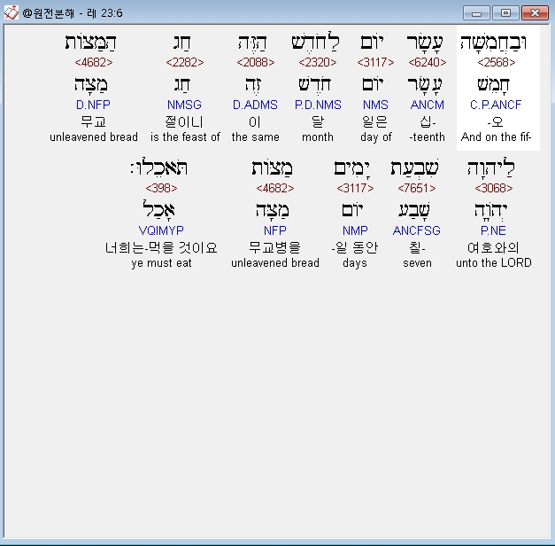 히브리어구약BHS,6 וּבַחֲמִשָּׁה עָשָׂר יֹום לַחֹדֶשׁ הַזֶּה חַג הַמַּצֹּות לַיהוָה שִׁבְעַת יָמִים מַצֹּות תֹּאכֵלוּ׃
