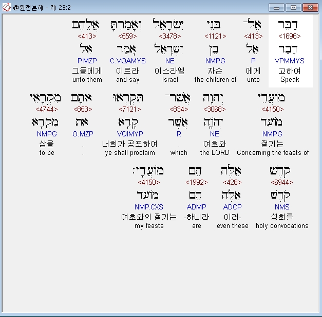 히브리어구약BHS,2 דַּבֵּר אֶל־בְּנֵי יִשְׂרָאֵל וְאָמַרְתָּ אֲלֵהֶם מֹועֲדֵי יְהוָה אֲשֶׁר־תִּקְרְאוּ אֹתָם מִקְרָאֵי קֹדֶשׁ אֵלֶּה הֵם מֹועֲדָי׃