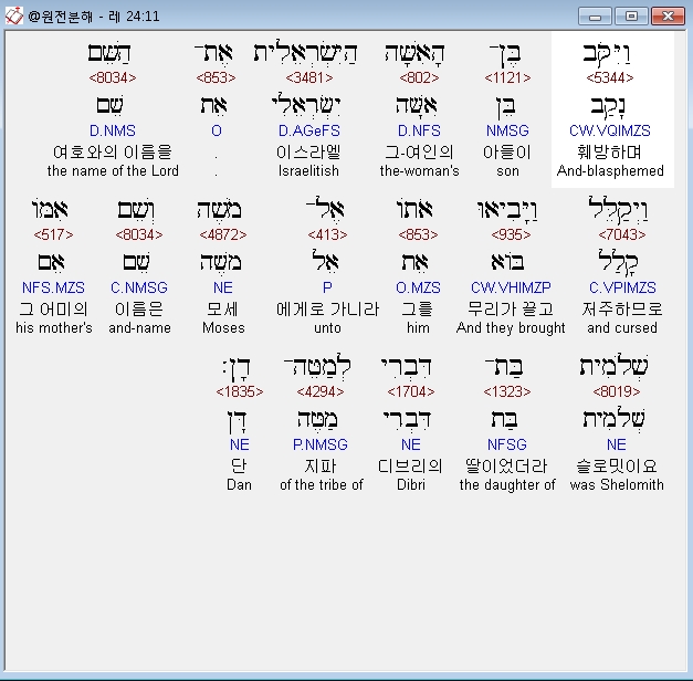 영어NASB,23 Then Moses spoke to the sons of Israel, and they brought the one who had cursed outside the camp and stoned him with stones. Thus the sons of Israel did, just as the LORD had commanded Moses.