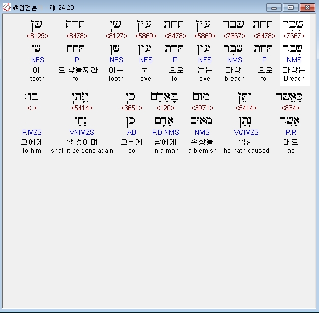 히브리어구약BHS,20 שֶׁבֶר תַּחַת שֶׁבֶר עַיִן תַּחַת עַיִן שֵׁן תַּחַת שֵׁן כַּאֲשֶׁר יִתֵּן מוּם בָּאָדָם כֵּן יִנָּתֶן בֹּו׃