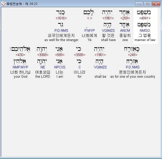 히브리어구약BHS,22 מִשְׁפַּט אֶחָד יִהְיֶה לָכֶם כַּגֵּר כָּאֶזְרָח יִהְיֶה כִּי אֲנִי יְהוָה אֱלֹהֵיכֶם׃