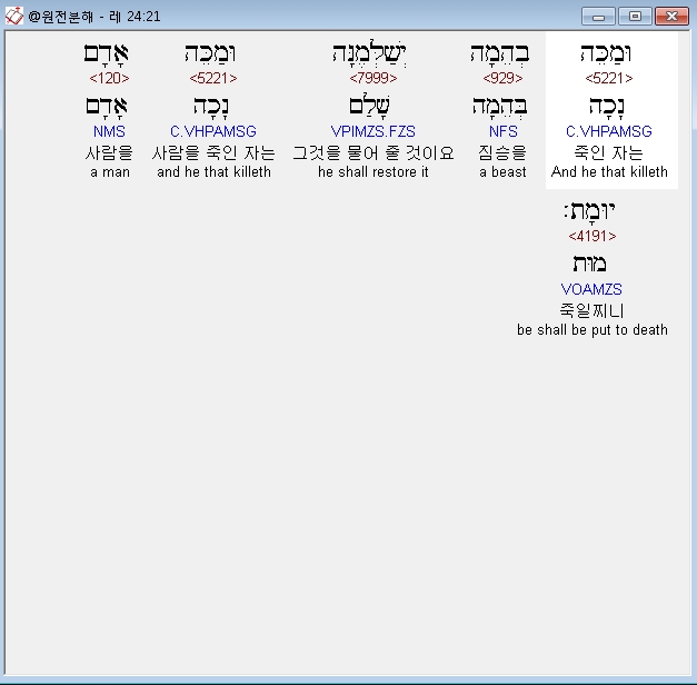 히브리어구약BHS,21 וּמַכֵּה בְהֵמָה יְשַׁלְּמֶנָּה וּמַכֵּה אָדָם יוּמָת׃