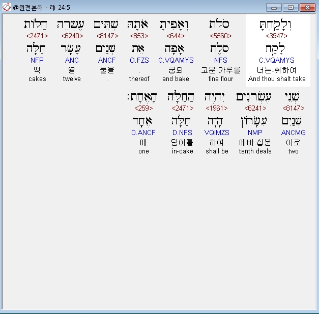 히브리어구약BHS,5 וְלָקַחְתָּ סֹלֶת וְאָפִיתָ אֹתָהּ שְׁתֵּים עֶשְׂרֵה חַלֹּות שְׁנֵי עֶשְׂרֹנִים יִהְיֶה הַחַלָּה הָאֶחָת׃