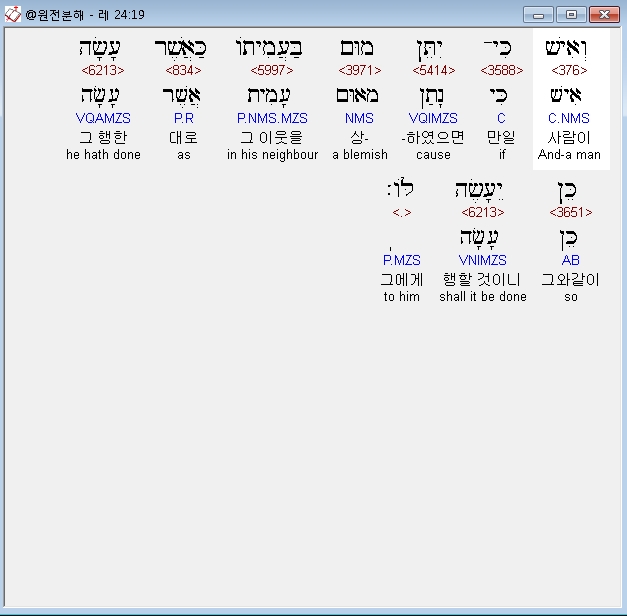 히브리어구약BHS,19 וְאִישׁ כִּי־יִתֵּן מוּם בַּעֲמִיתֹו כַּאֲשֶׁר עָשָׂה כֵּן יֵעָשֶׂה לֹּו׃