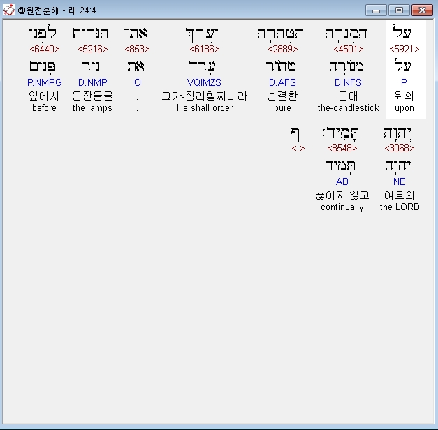 히브리어구약BHS,4 עַל הַמְּנֹרָה הַטְּהֹרָה יַעֲרֹךְ אֶת־הַנֵּרֹות לִפְנֵי יְהוָה תָּמִיד׃ ף