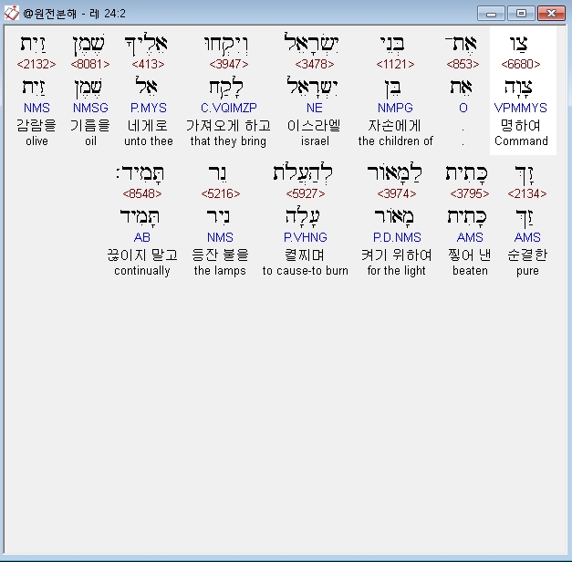 영어NASB,2 "Command the sons of Israel that they bring to you clear oil from beaten olives for the light, to make a lamp burn continually.