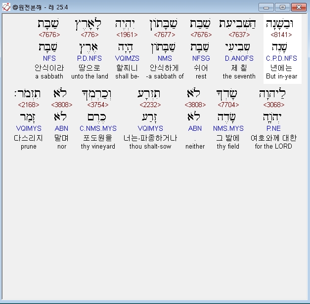 히브리어구약BHS,4 וּבַשָּׁנָה הַשְּׁבִיעִת שַׁבַּת שַׁבָּתֹון יִהְיֶה לָאָרֶץ שַׁבָּת לַיהוָה שָׂדְךָ לֹא תִזְרָע וְכַרְמְךָ לֹא תִזְמֹר׃