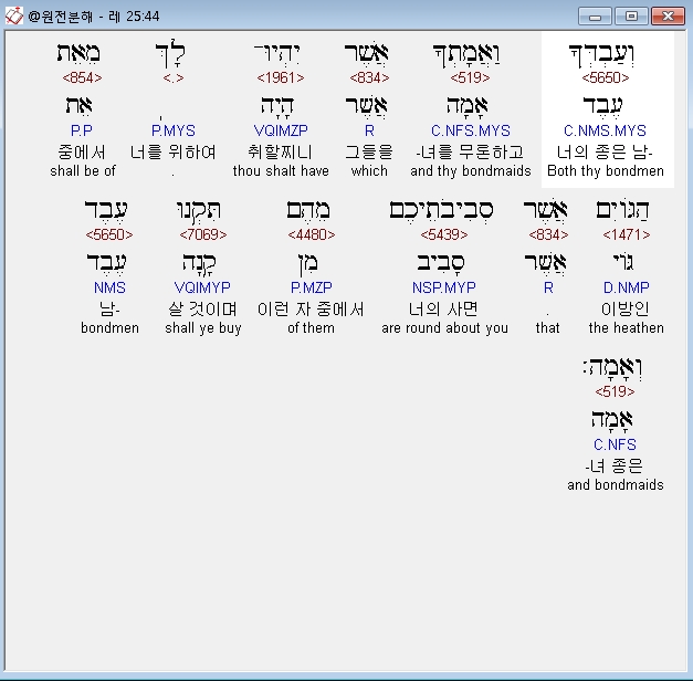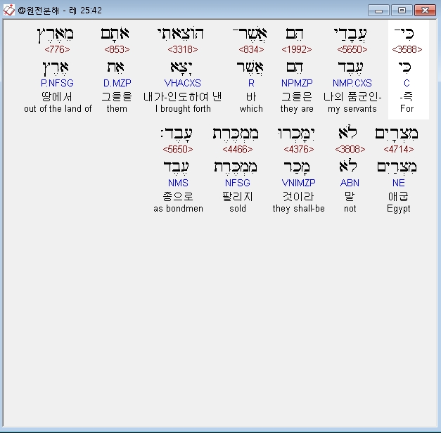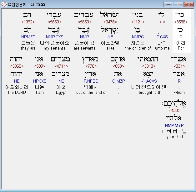 히브리어구약BHS,55 כִּי־לִי בְנֵי־יִשְׂרָאֵל עֲבָדִים עֲבָדַי הֵם אֲשֶׁר־הֹוצֵאתִי אֹותָם מֵאֶרֶץ מִצְרָיִם אֲנִי יְהוָה אֱלֹהֵיכֶם׃