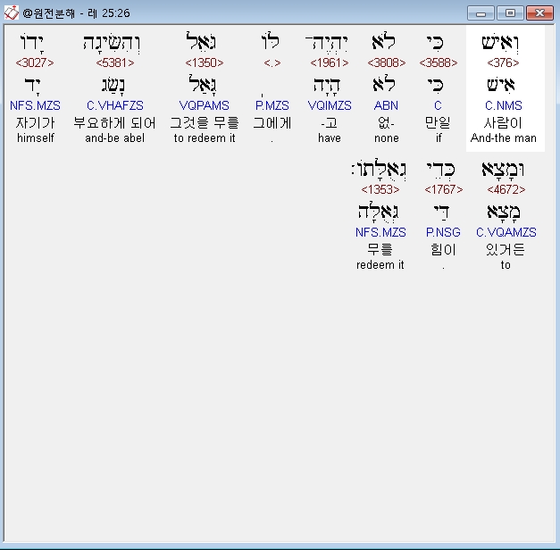 근족 중 누구든지 속할 것이요 - 히브리인이 이방인의 노예가 되었을 경우, 그러한 자의 속량을 위한 고엘 제도에 관한 언급이다. 이 고엘의 의무는 노예된 자와 혈통적으로 가까운 친척일수록 우선권이 부여되는데, 그 친척이 속량할 능력이 없을때는 점차 먼 친족에게로 확산되었다. 그 순서는 대개 형제 삼촌 사촌 등으로 연결된다. 한편 유대인들의 말에 의하면, 이방인에게 종으로 팔린 동족 히브리인을 그의 근족 중 누구도 속량할 능력이 없는 경우에는 '공공기금을 들여서라도 반드시 구속해야 함이 마땅하다'고 전한다(Matthew Henry's Commentary. Vol. 1. p. 551).
