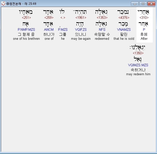 헬라어구약Septuagint,49 αδελφος πατρος αυτου η υιος αδελφου πατρος λυτρωσεται αυτον η απο των οικειων των σαρκων αυτου εκ της φυλης αυτου λυτρωσεται αυτον εαν δε ευπορηθεις ταις χερσιν λυτρωσηται εαυτον