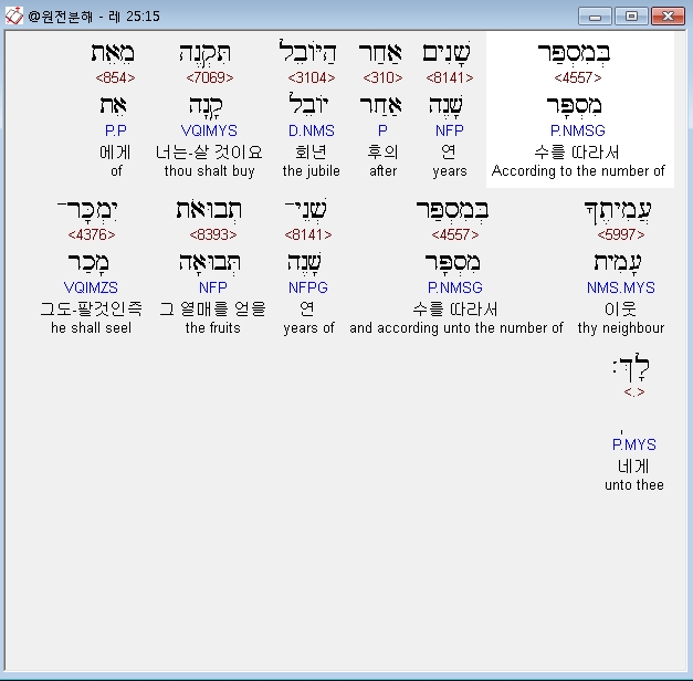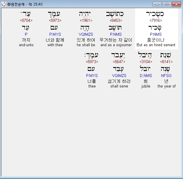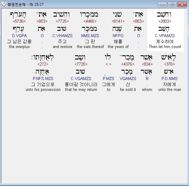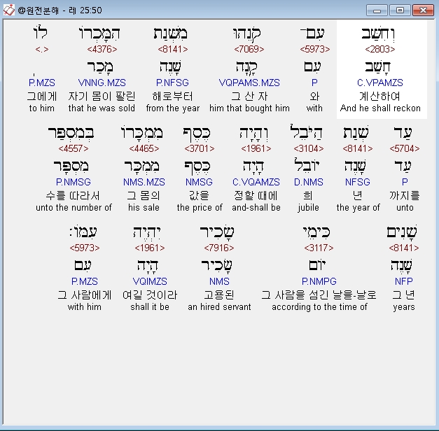 히브리어구약BHS,50 וְחִשַּׁב עִם־קֹנֵהוּ מִשְּׁנַת הִמָּכְרֹו לֹו עַד שְׁנַת הַיֹּבֵל וְהָיָה כֶּסֶף מִמְכָּרֹו בְּמִסְפַּר שָׁנִים כִּימֵי שָׂכִיר יִהְיֶה עִמֹּו׃