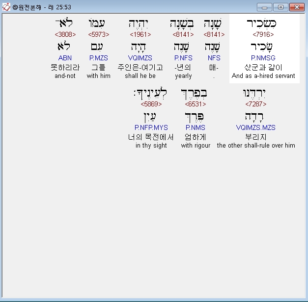 히브리어구약BHS,53 כִּשְׂכִיר שָׁנָה בְּשָׁנָה יִהְיֶה עִמֹּו לֹא־יִרְדֶּנּוּ* בְּפֶרֶךְ לְעֵינֶיךָ׃