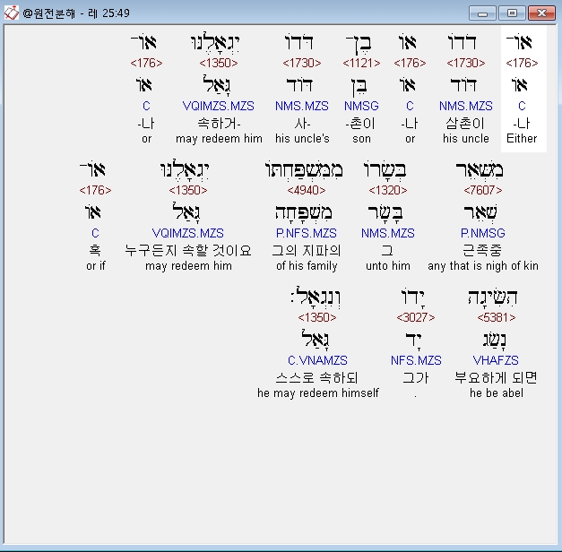 히브리어구약BHS,49 אֹו־דֹדֹו אֹו בֶן־דֹּדֹו יִגְאָלֶנּוּ אֹו־מִשְּׁאֵר בְּשָׂרֹו מִמִּשְׁפַּחְתֹּו יִגְאָלֶנּוּ אֹו־הִשִּׂיגָה יָדֹו וְנִגְאָל׃